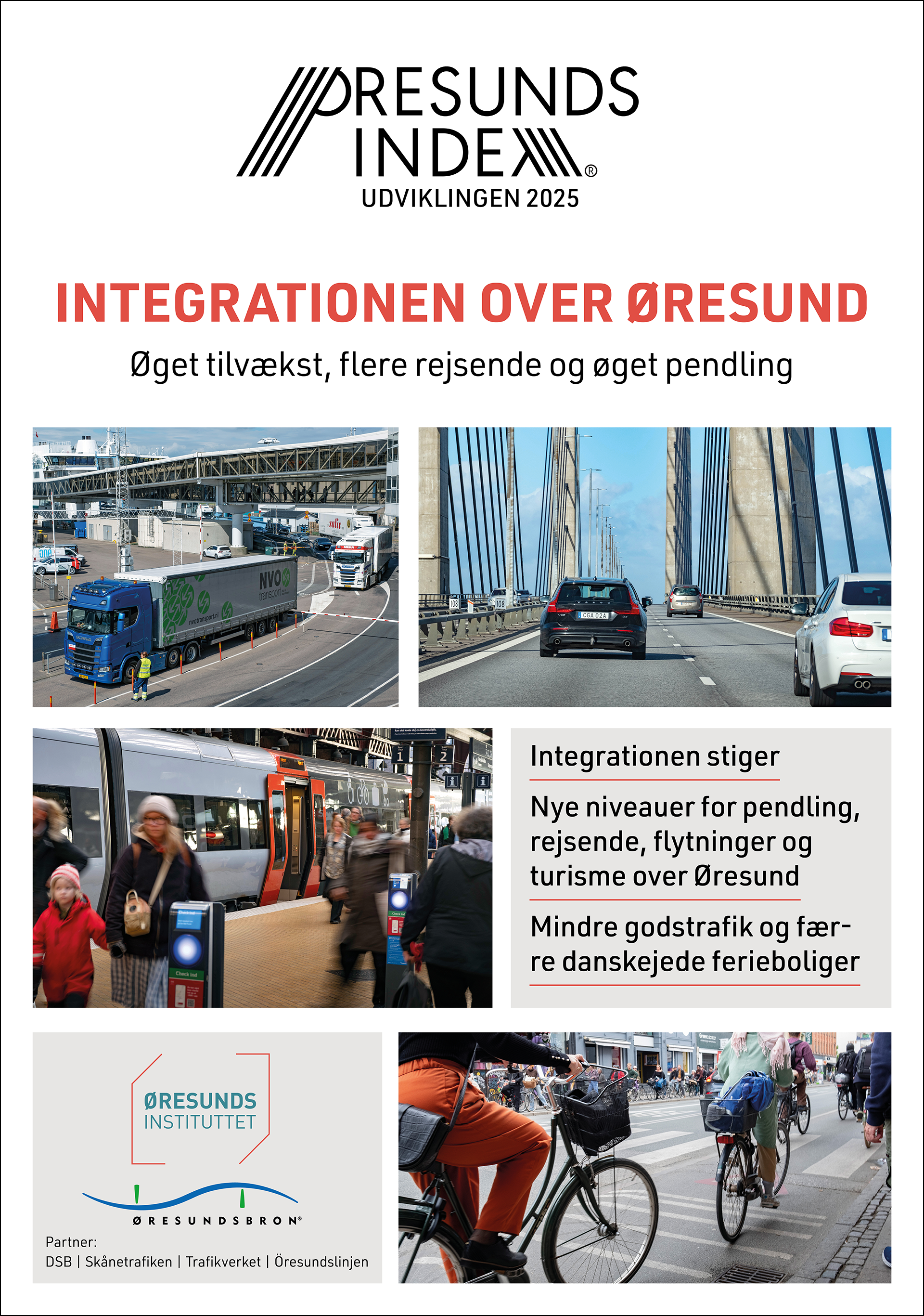 Siden indvielsen af Øresundsbron for 25 år siden er integrationen i Øresundsregionen steget kraftigt trods udfordringer undervejs. Det viser Øresundsindex, som måler integrationen ud fra ni parametre. Indekset steg til 234 i 2024 – en øgning på 134 procent i forhold til 2001, som er det første år med helårsstatistik. Det er en topnotering, og det er især fire områder, der har bidraget til øget integration over Øresund - pendling, godstransport, personrejser og danskejede fritidshuse i Skåne. Men også de øvrige seks parametre, der indgår i Øresundsindex’ måling af integrationen på tværs af Øresund, er steget.
