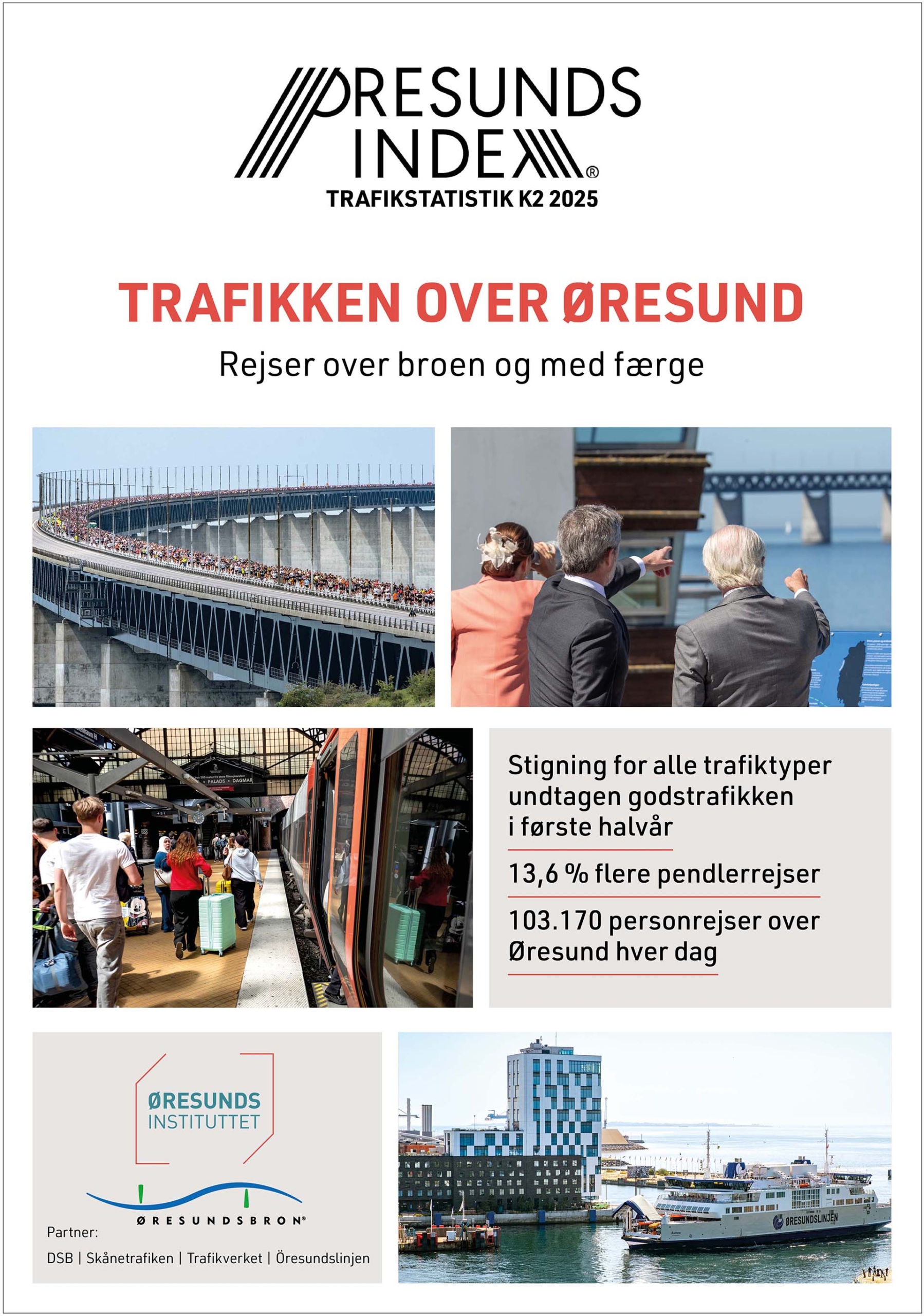 Mest steg antallet af pendlerrejser, plus 13,6 procent i første halvår 2025 sammenlignet med samme periode året før. Det samlede antal personrejser steg med 6,7 procent i første halvår, mens antallet af personbiler, der passerede over Øresund via bro og færge, steg med 6,1 procent. Det viser rapporten Øresundsindex trafikstatistik, som Øresundsinstituttet udarbejder på opdrag af Øresundsbro Konsortiet.
