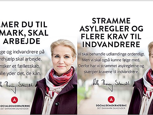 I Köpenhamn lyser ett nytt budskap fram från Socialdemokraternes partiledare och landets statsminister Helle Thorning-Schmidt – ”stramare asylregler och fler krav på invandrarna”. Den nya kampanjen tar upp kampen med det borgerliga blocket inför det kommande Folketingsvalet som måste hållas senast den 15 september. – Vi ska behandla utlänningar ordentligt och rimligt. Men vi ska [&hellip
