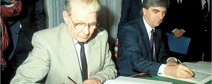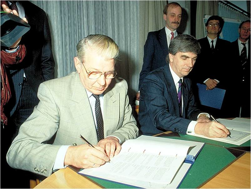 Den 23 mars 1991 skrev Danmarks trafikminister Kaj Ikast (Konservative) och Sveriges kommunikationsminister Georg Andersson (S) under avtalet om att bygga Öresundsbron. Foto: Øresundsbro Konsortiet