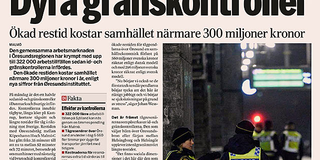 De gemensamma arbetsmarknaden i Öresundsregionen har krympt med upp till 322 000 arbetstillfällen sedan id- och gränskontrollerna infördes och den ökade restiden kostar samhället närmare 300 miljoner kronor i år. Det visar helt nya siffror från Øresundsinstituttet som Dagens industri tagit del av. Læs mere