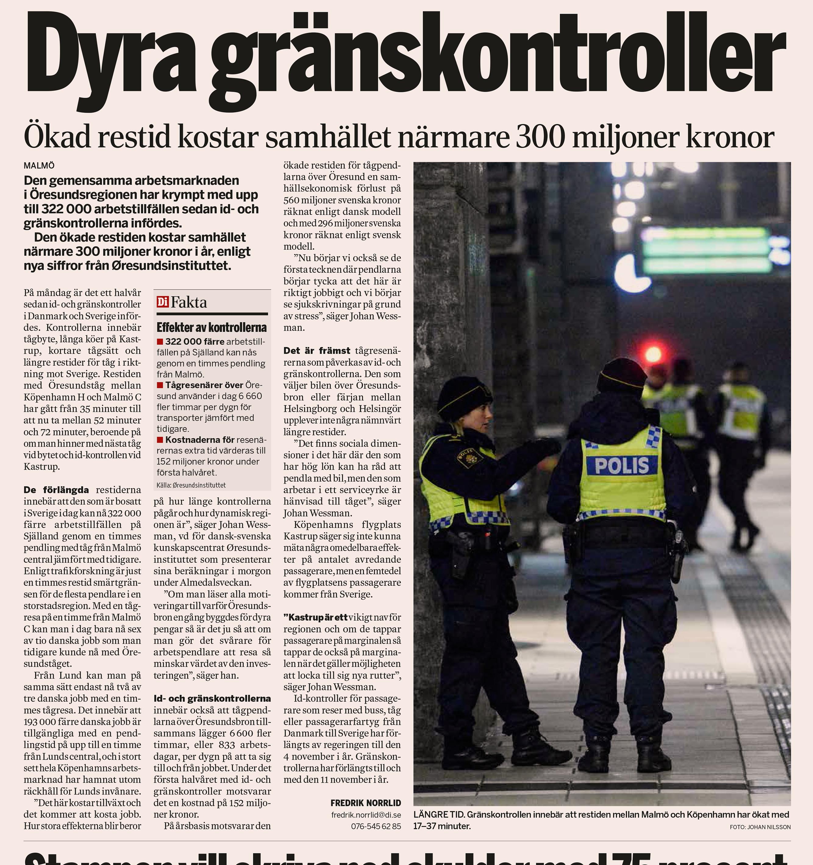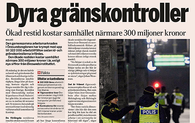 De gemensamma arbetsmarknaden i Öresundsregionen har krympt med upp till 322 000 arbetstillfällen sedan id- och gränskontrollerna infördes och den ökade restiden kostar samhället närmare 300 miljoner kronor i år. Det visar helt nya siffror från Øresundsinstituttet som Dagens industri tagit del av. Læs mere