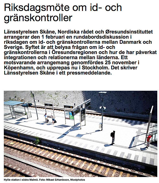 Länsstyrelsen Skåne, Nordiska rådet och Øresundsinstituttet arrangerar den 1 februari en rundabordsdiskussion i riksdagen om id- och gränskontrollerna mellan Danmark och Sverige. Syftet är att belysa frågan om id- och gränskontrollerna i Öresundsregionen och hur de har påverkat integrationen och relationerna mellan länderna. Ett motsvarande arrangemang genomfördes 25 november i Köpenhamn, och upprepas nu i Stockholm. Det skriver Länsstyrelsen Skåne i ett pressmeddelande.